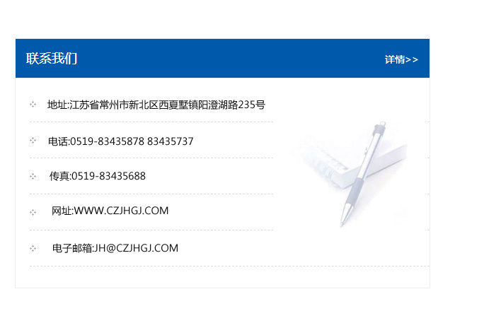 地址:常州市新北區友邦商務大廈1幢16、17層  電話:0519-85101652  傳真:0519-85112595  郵編:213022  網址:www_cz-jiayue_cn.anlaifang.com  郵箱:xiajifengaa@163.com